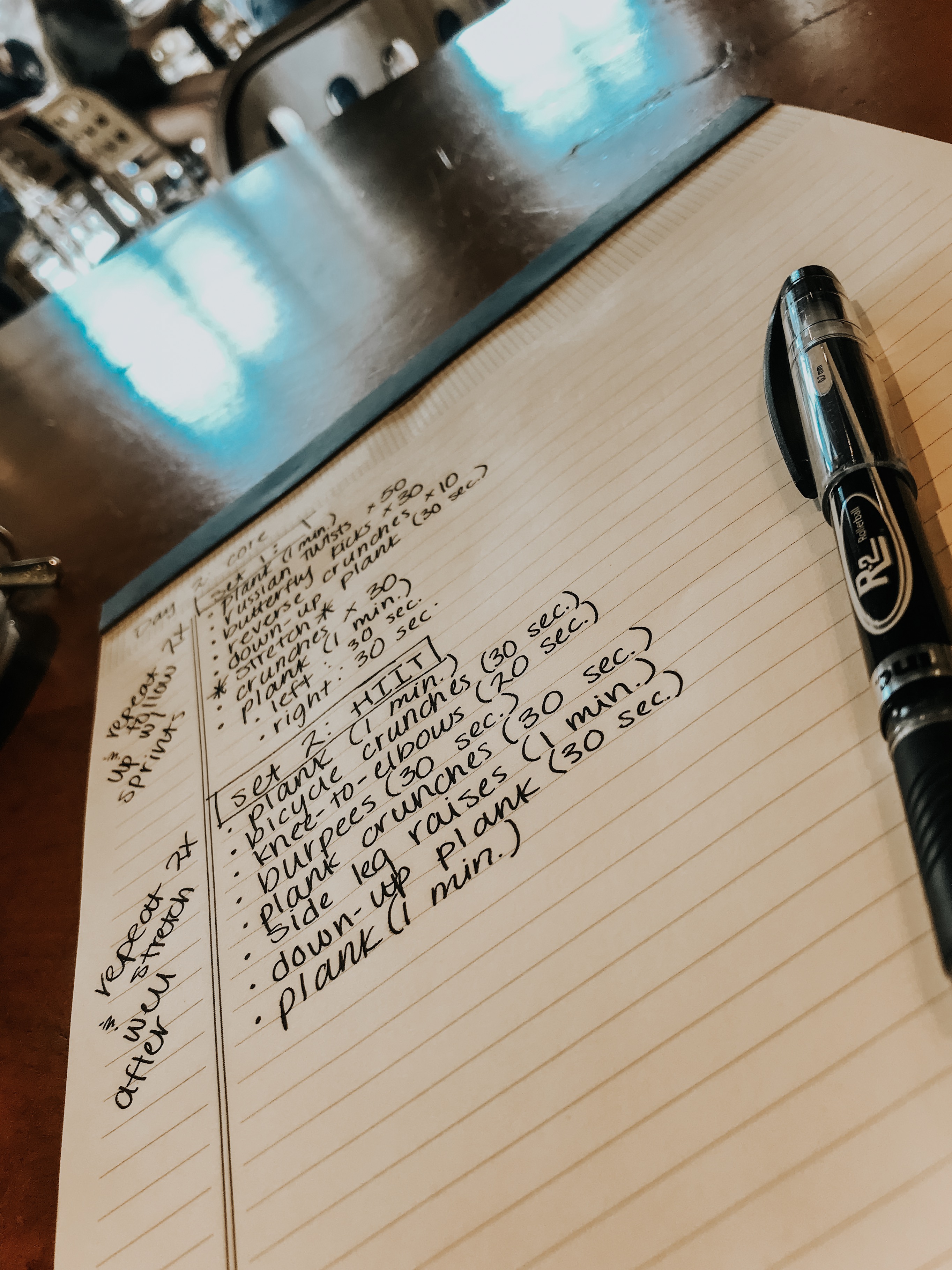 After you have a list, you can start narrowing down your list to make a few different sets. (A set is a group of consecutive repetitions, referred to as “reps.”) I typically repeat a set two or three times in one workout session depending on the difficulty and amount of time it takes. It’s also nice to have at least two different sets to choose from so that when you come to a day in your rotation, you have options depending on what you feel that day. Take it to the gym with you (or take a picture on your phone) or set it next to you when you work out in the comfort of your own room.