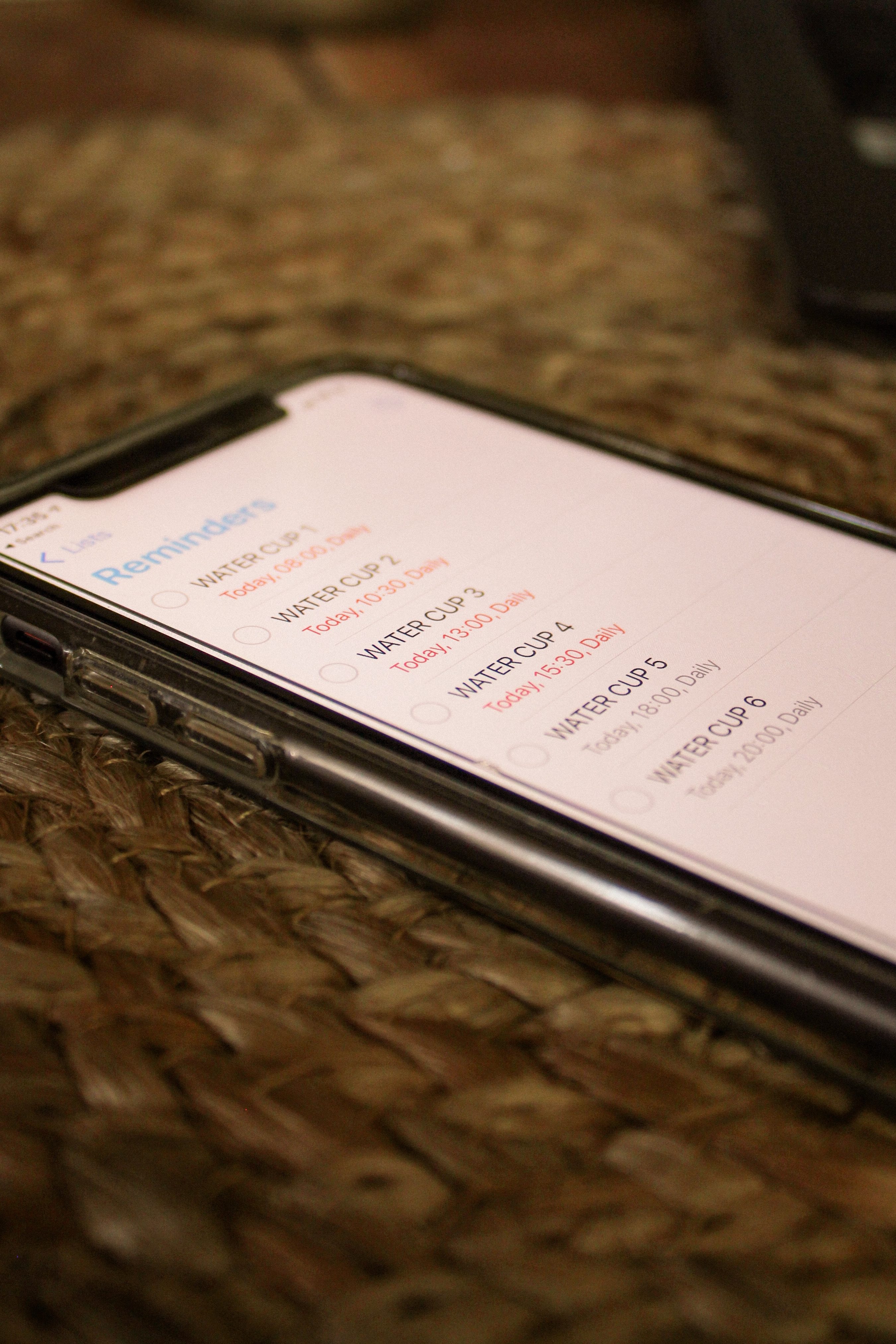This has probably been the most effective part of my routine. I use the Reminders app on my phone to, well, remind myself to drink my water. For example, I’m aiming to drink about 80-90 oz. of water per day, so I broke that down throughout the day depending on the size of the cup/water bottles from which I’m drinking. At the moment, I’ve been drinking from an 18 oz. cup, so my reminders go off every 2 1/2 hours to remind me that I should have finished another cup full of water at that point.